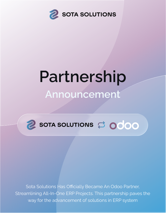 Sota Solutions đã chính thức ký hợp tác với Odoo vào tháng 9 năm 2022. Sota Solutions có kinh nghiệm triển khai thành công nhiều dự án ERP, thường xuyên sử dụng bản Odoo Community. Bằng cách trở thành đối tác của Odoo, Sota Solutions có thể mở ra những cơ hội mới để khai thác tài nguyên của phiên bản Odoo Enterprise, bao gồm quyền truy cập vào kho lưu trữ GitHub của Odoo Enterprise. Sự hợp tác chiến lược này cho phép Sota Solutions mở rộng khả năng của mình và phát triển các tính năng bổ sung như HRM, Bán lẻ, Sản xuất, Giao nhận vận tải, v.v...